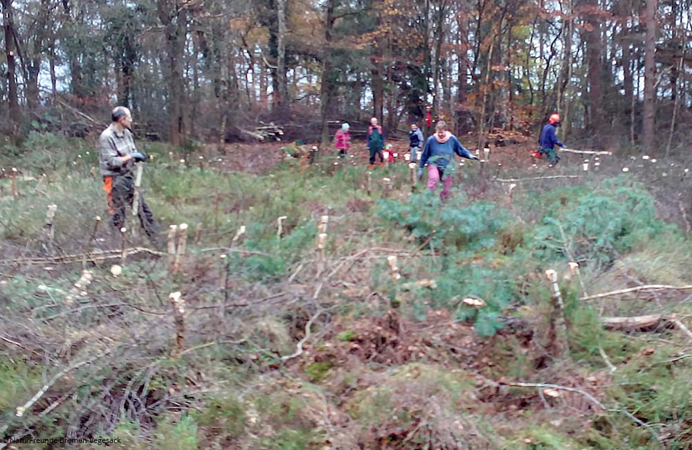 Unsere erste Vorsitzende Gisela Gieschen hat verschiedene lokale Expert*innen von NABU und BUND, sowie den zuständigen Naturschutzbeauftragten des Landkreis Osterholz, ausfindig gemacht und Ratschläge zu den notwendigen Arbeitsschritten eingeholt. Ausgerüstet mit Gummistiefeln und Arbeitshandschuhen sowie tatkräftiger Unterstützung der AG Moor des BUND Bremen wurden als erster Schritt die Birken und Jungkiefern aus dem Moor entfernt.